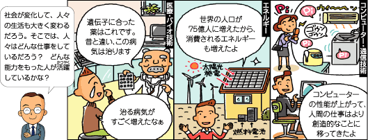 さらに、これからの社会の変化は、今までとは比較できないほど大きいと言われているんだ。特に大きく変わると言われているのは、コンピューター・通信技術・エネルギー・医療・バイオ技術の分野だよ。どれも高度な科学技術に支えられたもので、私たちの生活にも関係が深いね。